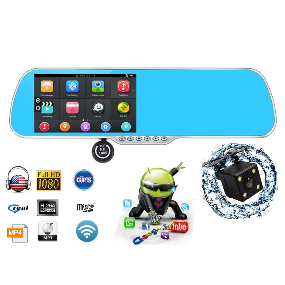 Main Features : 5.0" Android 4.4 Car GPS Navigation Rearview Mirror Radar Detectors Allwinner A33 1080P Car DVR with Wide Angle Rear Camera