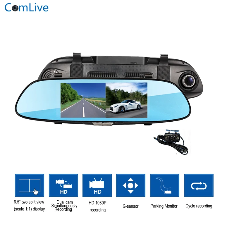 Main Features : 6.5" Novatek 96655 chip rearview mirror car camera DVR HD1080P dual cams video registrar split view display car video recorder
